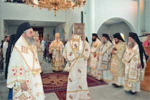 V neděli 2/15.6.2014, na svátek Všech svatých, se uskutečnila slavnostní mnohočetná archijerejská svatá liturgie, které předsedali prvohierarchové řecké a rumunské pravoslavné starostylní církve – arcibiskup Kallinikos a metropolita Vlasios. Slavnostní liturgie byla sloužena v chrámu sv. Athanasia a kromě uvedených prvohierarchů se jí zúčastnilo dalších osm biskupů z Řecka a tři biskupové z Rumunska. Společně s nimi sloužilo zhruba 10 kněžích a tři diákoni. Na závěr svaté liturgie pronesl slavnostní promluvu biskup Kliment gardikijský, sekretář Posvátného synodu Řecké pravoslavné starostylní církve. Arcibiskup Kallinikos předal metropolitovi Vlasiovi jako upomínkový dar obraz, na kterém je znázorněn velký zázrak Zjevení svatého Kříže, ke kterému došlo při všenoční svaté liturgii na svátek Povýšení svatého Kříže podle starého kalendáře v roce 1925 nedaleko Athén. Po skončení svaté liturgie bylo všem přítomným připraveno pohoštění ve veliké aule v přízemí chrámu.