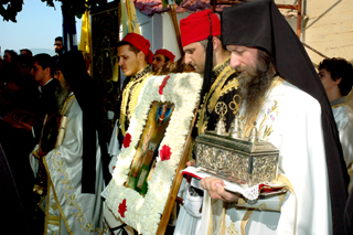 Poté následoval slavností průvod s ostatky a ikonou oslavovaných svatých Kypriána a Justiny kolem velkého poutního chrámu chrámu.