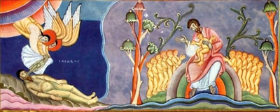 Jednoho dne ten žebrák zemřel a andělé ho odnesli do Abrahamova náručí. Zemřel i onen boháč a byl pohřben. Když v pekle pozvedl v mukách oči, spatřil v dálce Abrahama a Lazara v jeho náručí. ‚Otče Abrahame‘, zvolal boháč, ‚smiluj se nade mnou! Pošli Lazara, ať smočí koneček prstu ve vodě a svlaží mi jazyk, vždyť tu v tom plameni hrozně trpím.‘