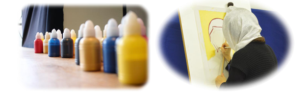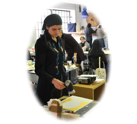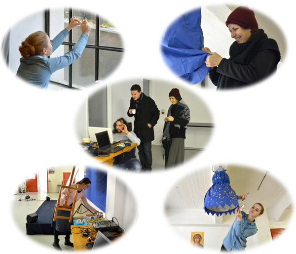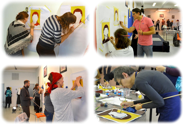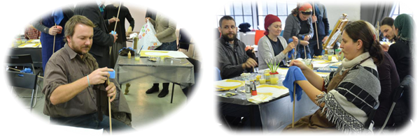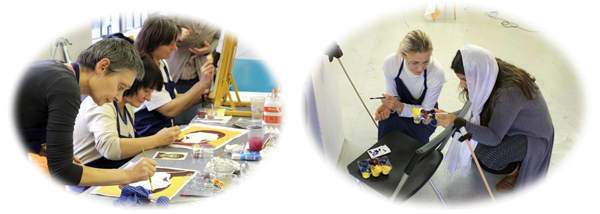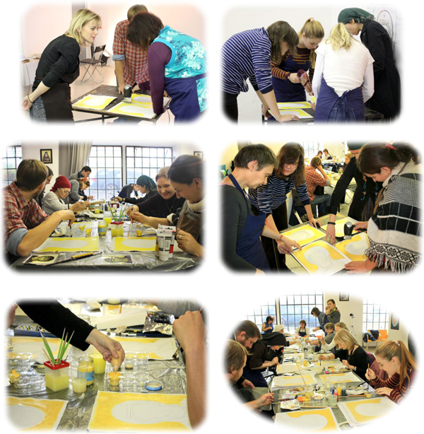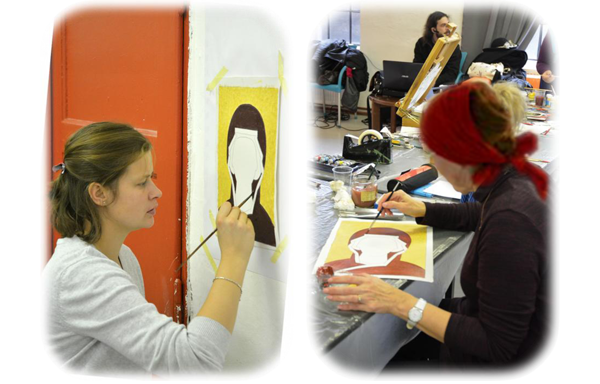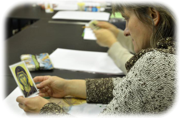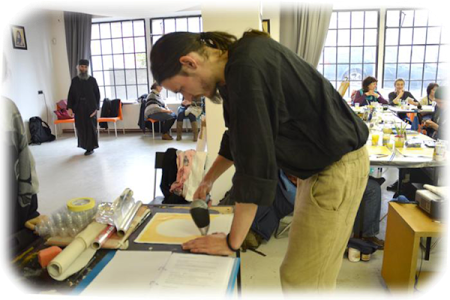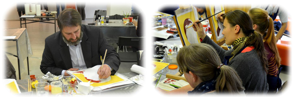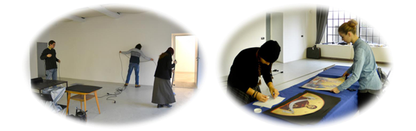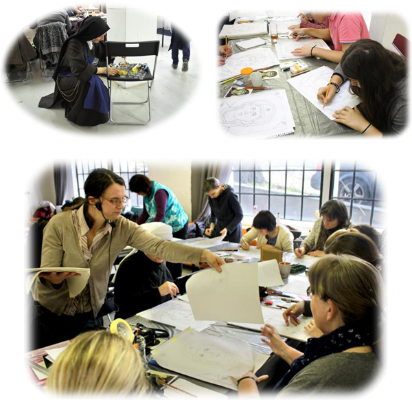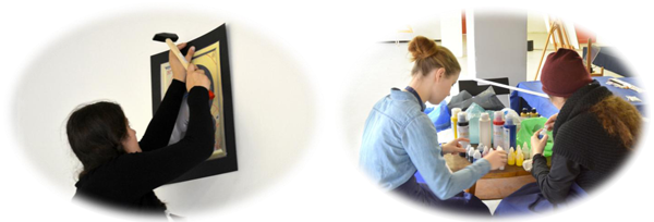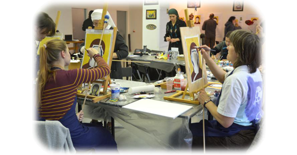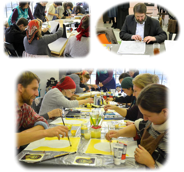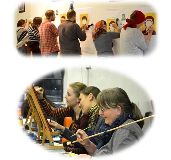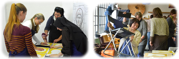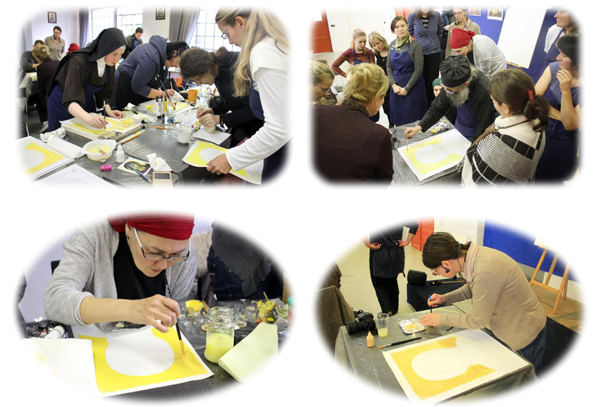 Po skončení teoretické části všichni účastníci společně připravují sál, abychom mohli začít s praktickou částí: malbou podoby Bohorodičky.