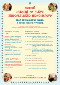 | 17.00-17.20 | Začátek semináře, o. Jiří Ján, ThD. (přivítání, představení, krátké uvedení do světa pravoslavné ikony) |